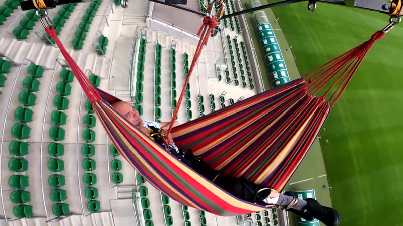 Po przybyciu na Stadion Śląska Wrocław i krótkim poznaniu z ekipą Dream Jump, od razu zauważyłem pozytywną energię bijącą od tych młodych ludzi przepełnionych pasją do tego co robią. Omówiliśmy wszystkie szczegóły dotyczące Swing Jump-u i bez większych problemów umieszczono mnie w hamaku. Wznoszenie na docelową wysokość 37 metrów przebiegało spokojnie ze wzrostem adrenaliny adekwatnie do bliskości dachu stadionu.