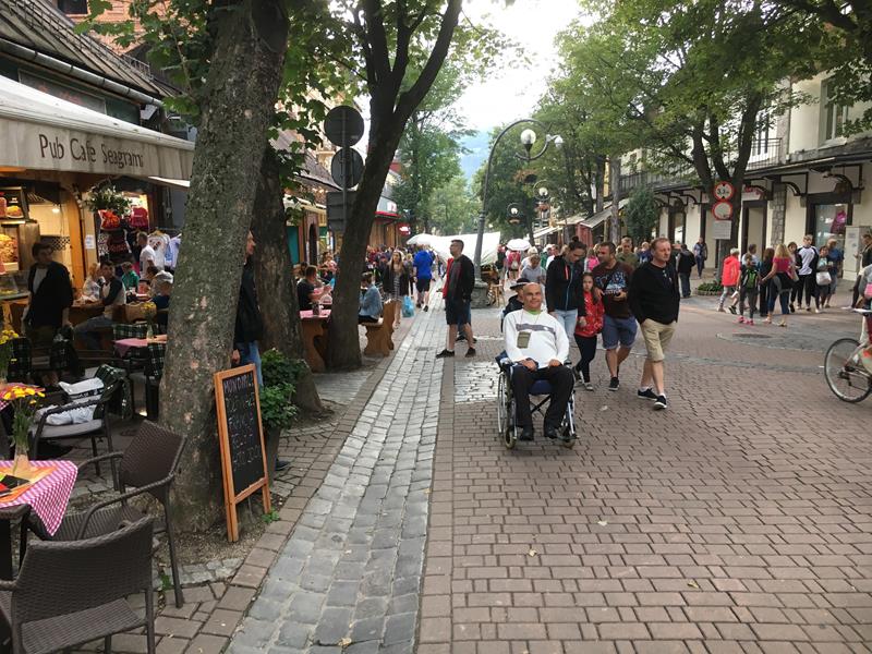 Poruszanie się na wózku inwalidzkim głównym deptakiem Zakopanego jest dość łatwe: podłoże jest płaskie i brak większych nachyleń terenu.
